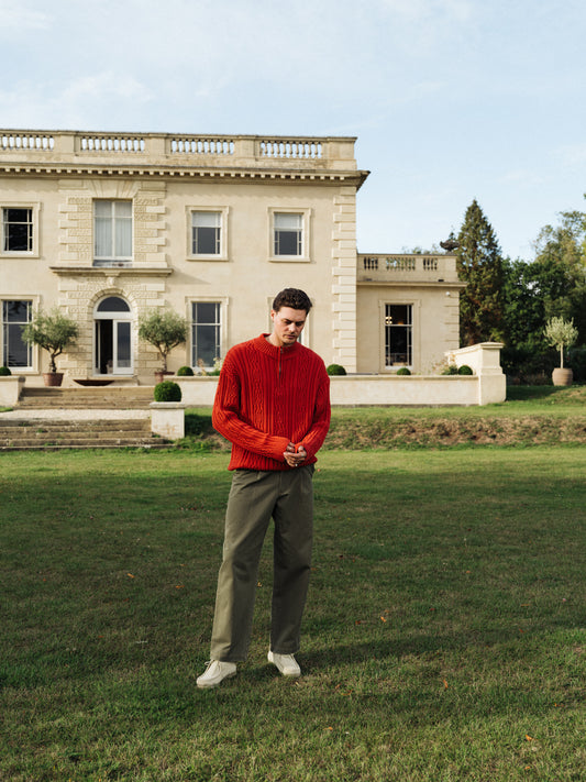 CABLE KNIT HALF ZIP PULLOVER - RUST RED