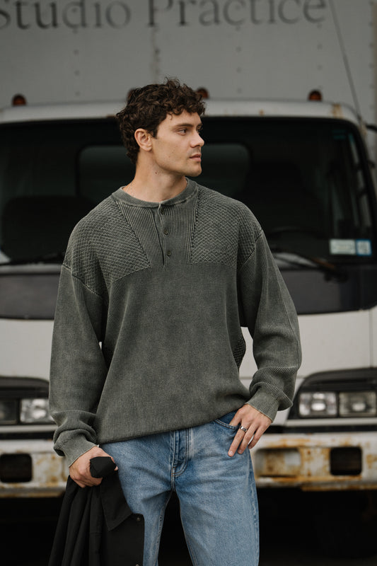 HALF BUTTON PANEL ACID WASHED PULLOVER - GREEN