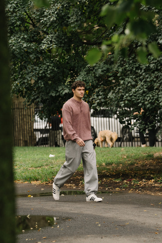 HALF BUTTON PANEL ACID WASHED PULLOVER - CARDINAL