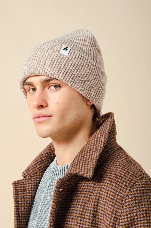 ORGANIC FISHERMAN RIBBED LABEL BEANIE - SAND