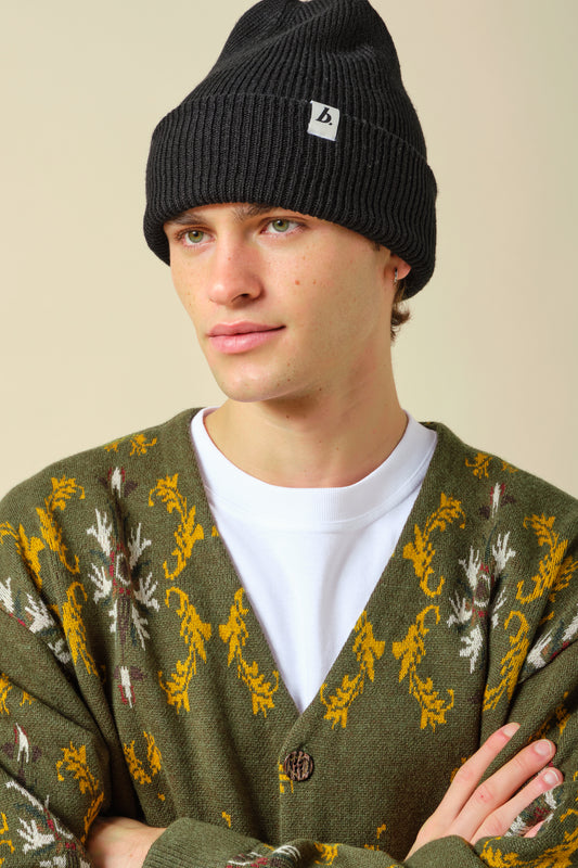 OVERSIZED RECYCLED CUFFED LABEL BEANIE - BLACK