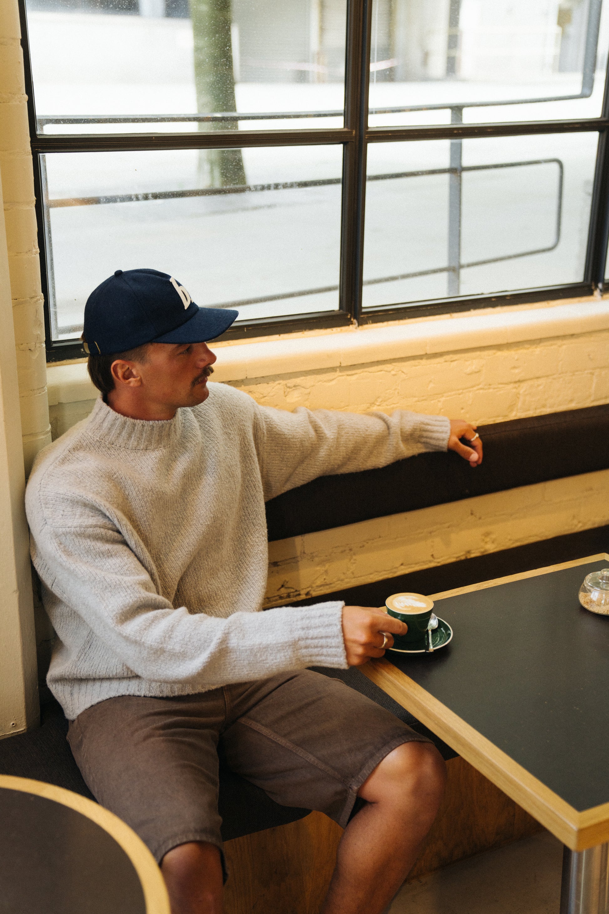 Eric is 6,2ft (185cm) and wears a size L in the knit sweater. It fits like our classic knitwear sweaters with an oversized relaxed style fit. Size down for a more fitted look.