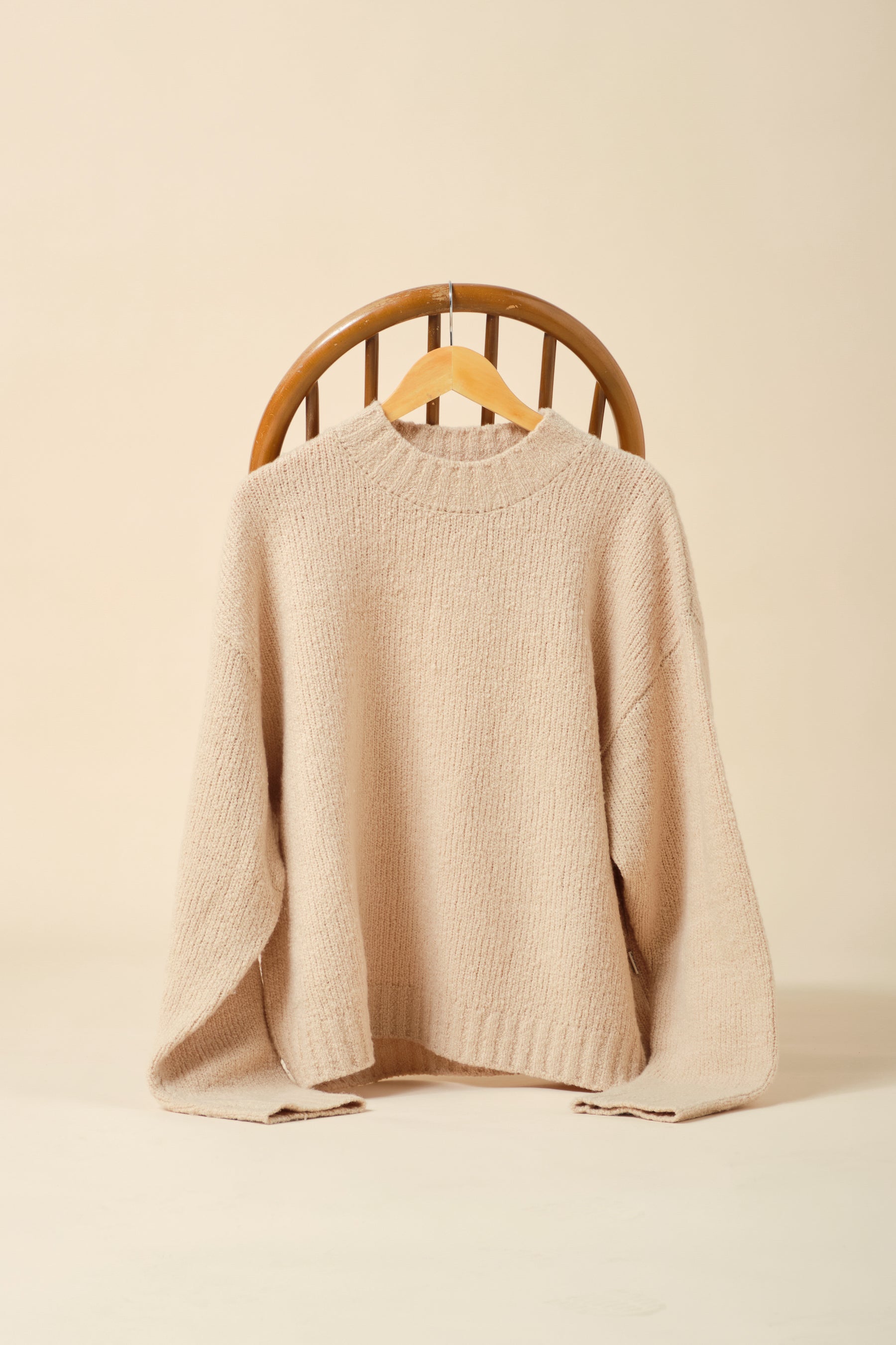 Model is 6ft (184cm) and wears a size L in the knit sweater. It fits like our classic knitwear sweaters with an oversized relaxed style fit. Size down for a more fitted look.