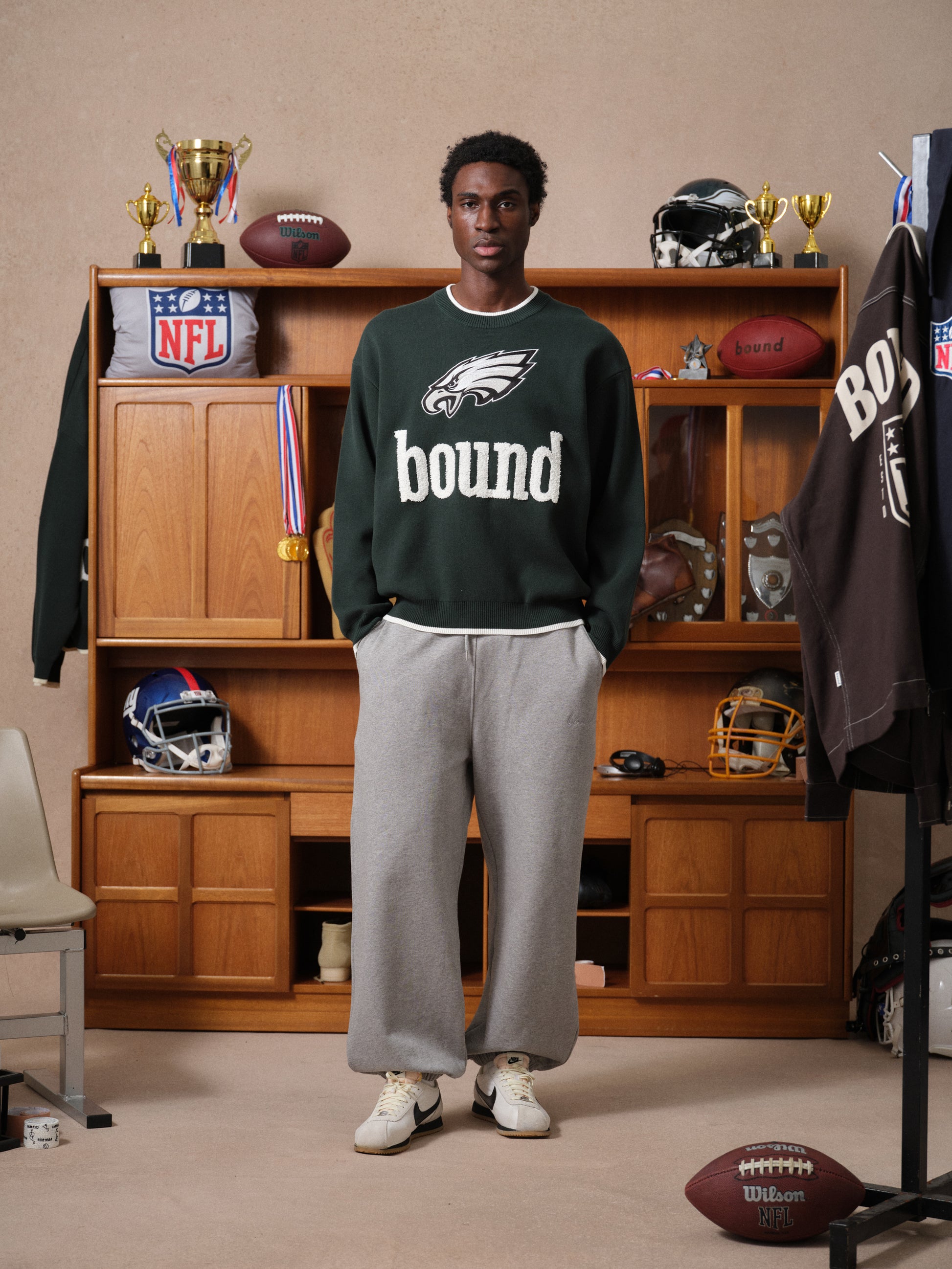 A landmark collaboration between bound and the NFL. Boasting our product strengths as a brand. Chore & vintage jackets, knitwear & jersey. Including two iconic teams the New York Giants and the Philadelphia Eagles. Our purpose of this collaboration is to show how a small independent from the UK can showcase the iconic brand of a major organisation. Americana fashion has always been at the heart of bound, in one way or another.