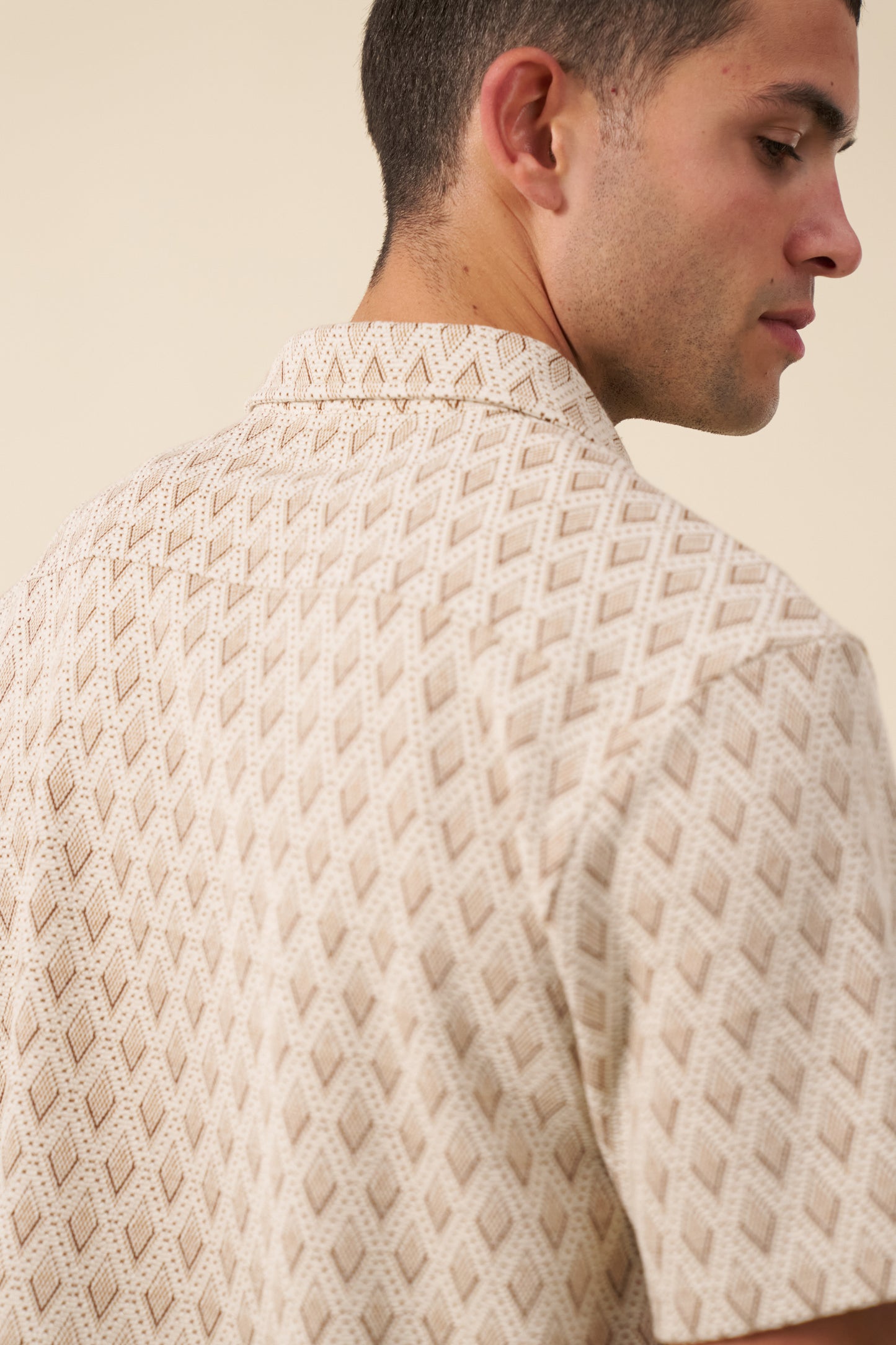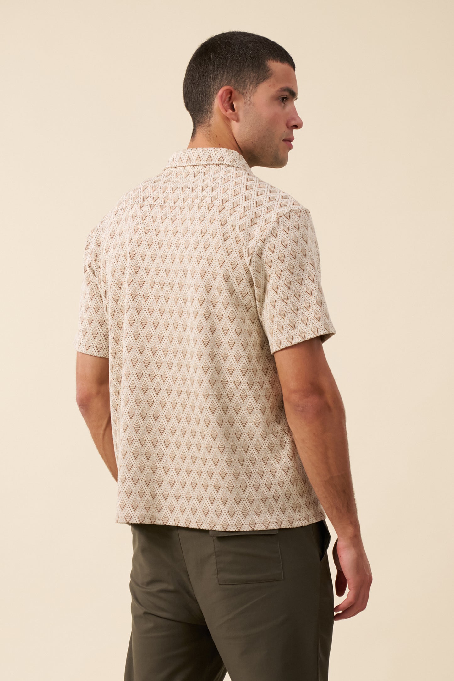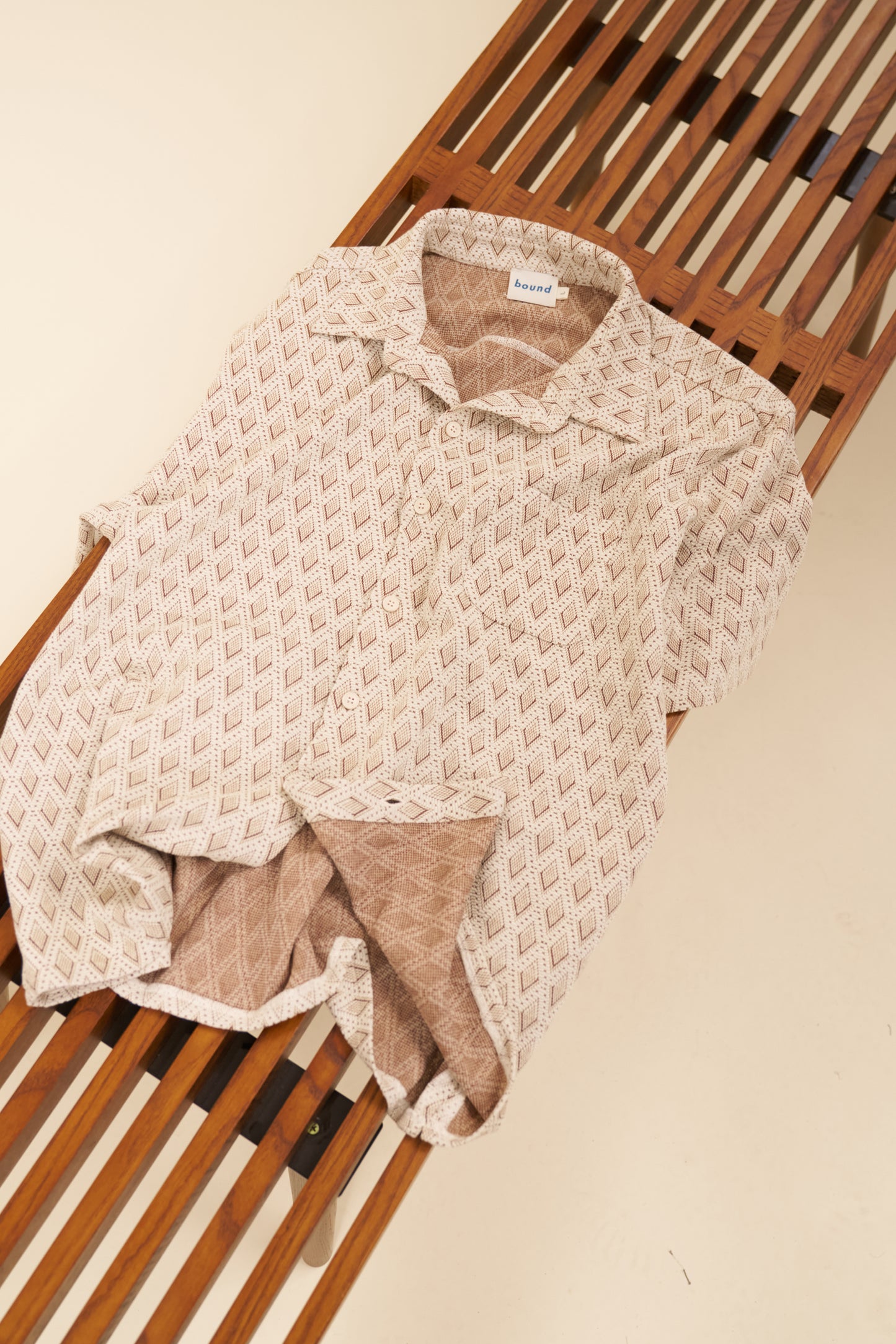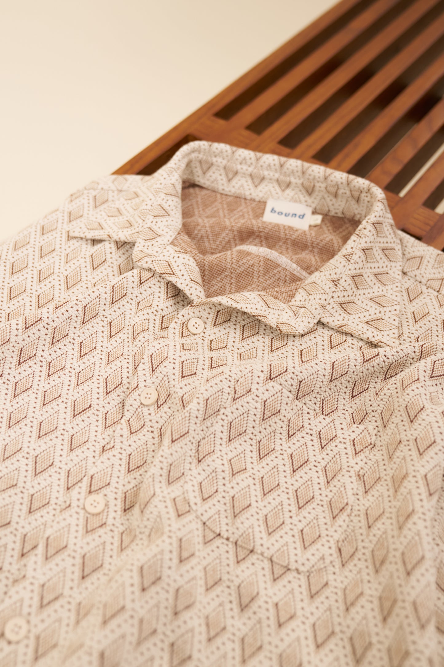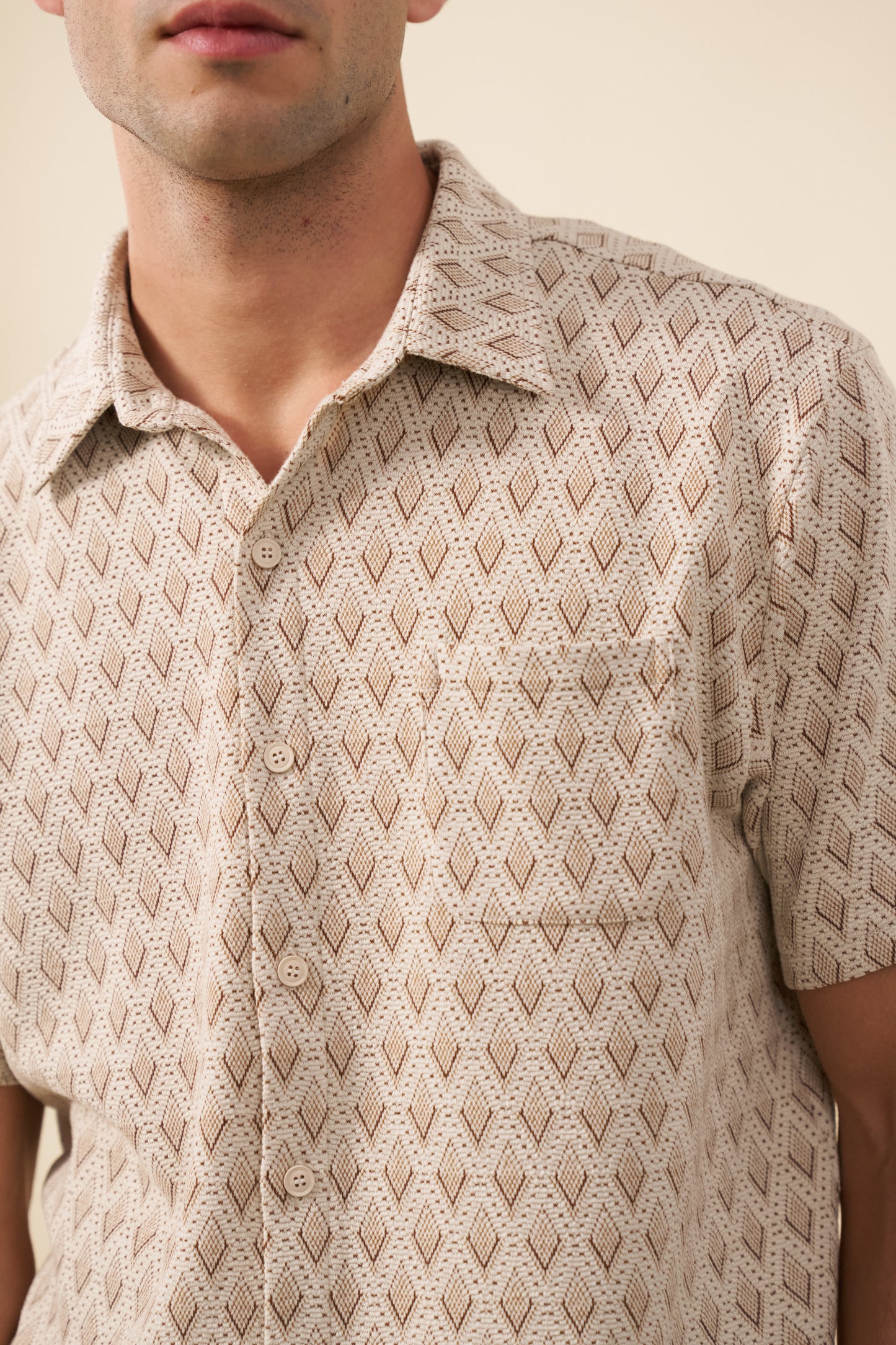 A textured poly jacquard with woven patterns throughout its off-white colour & brown design..